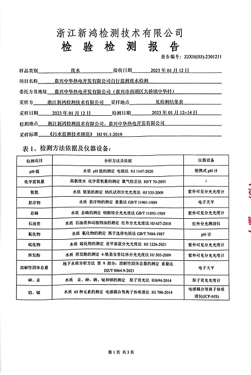 報(bào)告名稱:中華熱電2023.1-3月廢水檢測(cè)報(bào)告