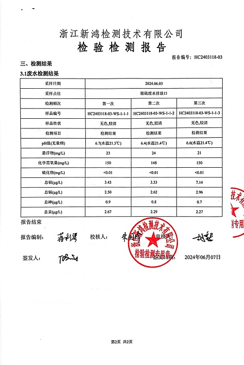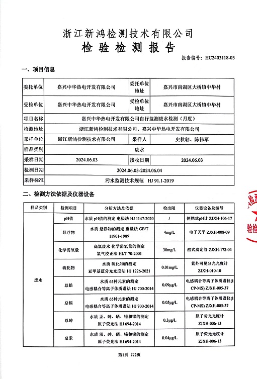報告名稱:2024年中華熱電6月廢水檢測報告